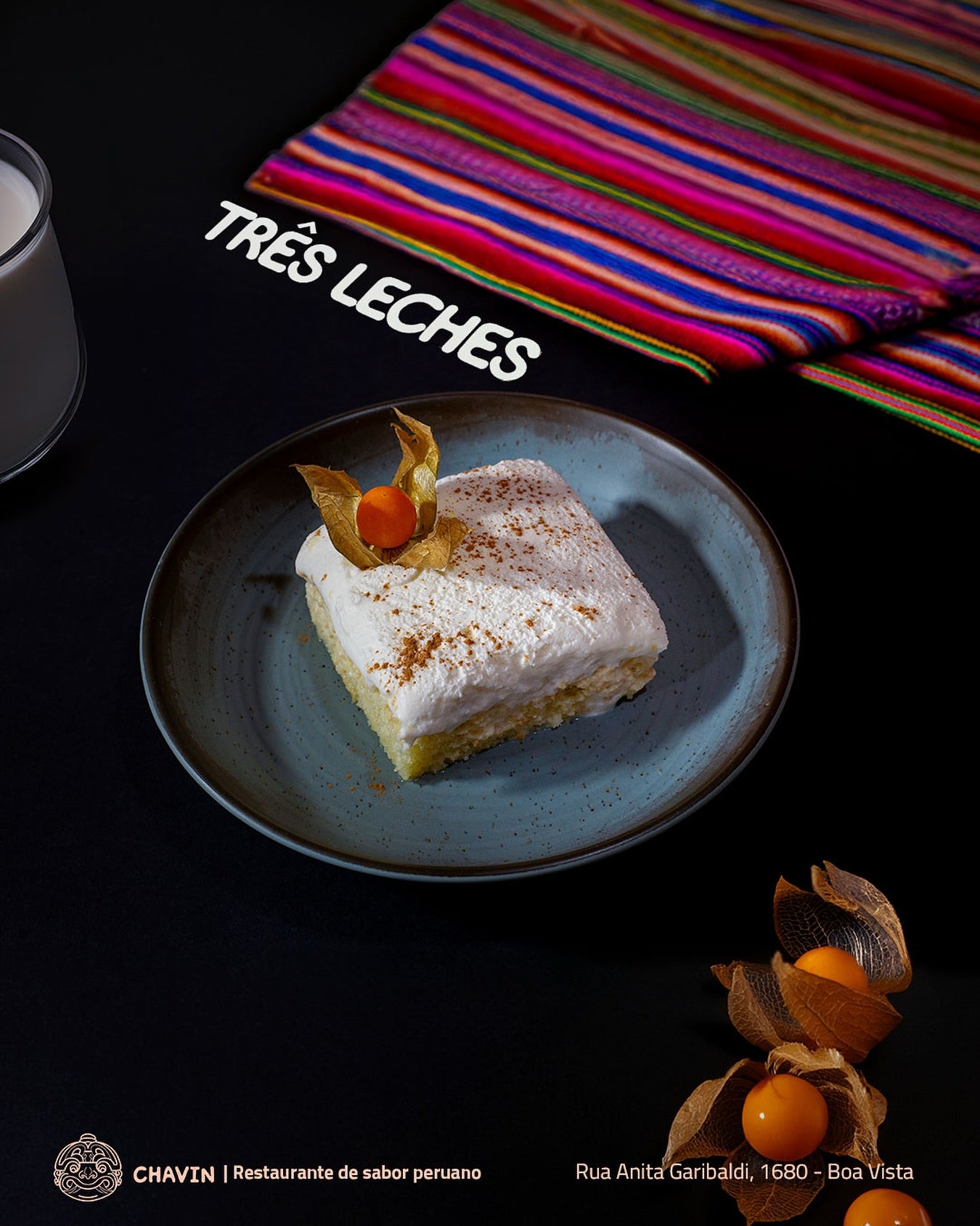E para finalizar, a doçura e leveza da nossa clássica Torta Tres Leches. Um bolo macio e úmido, embebido em três tipos de leite e coberto com um merengue suave, o toque perfeito para adoçar seu dia.